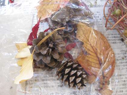 生活科「あきといっしょに」の学習とも合体させて,秋のもの(どんぐりや松ぼっくり,落ち葉など)を使って作りました。