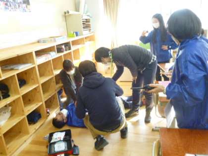 本日,教職員で安全シミュレーション研修を行いました。教室で子どもが体調不良になったという想定のもと,心臓マッサージやAEDの措置を行う,職員室に連絡し救急車を呼ぶなどの流れを,教職員で役割分担をし研修を進めました。