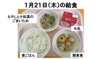 麦ごはん・牛乳・関東煮・もやしと小松菜のごまいためです。