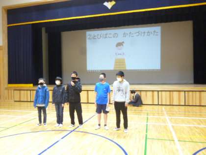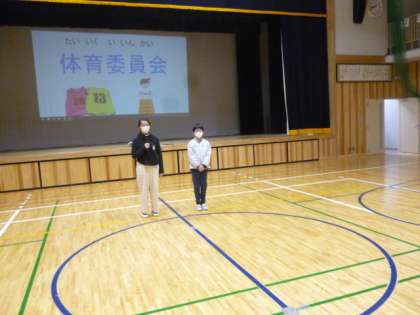 今日は体育委員会と給食委員会からの発信です。体育委員会では,体育で使う用具の片付け方について,給食委員会からは給食週間の取組について紹介しました。