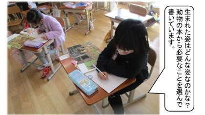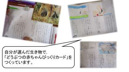 国語「どうぶつの赤ちゃん」では,教科書の「どうぶつの赤ちゃん」で学習したことを生かして,自分の選んだ動物の「どうぶつの赤ちゃん びっくりカード」をつくっています。