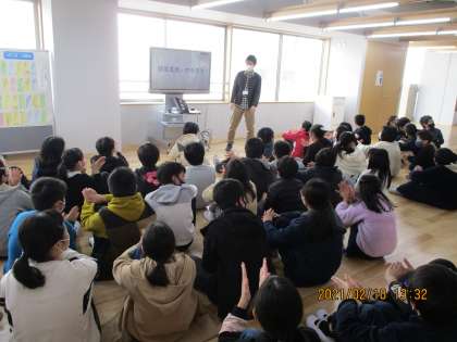 話を聞いたあと,水軍太鼓に取り組んでいる因島南小学校から,「もういちどつながりませんか。」という連絡が来たという話をしました。子どもたちからは,「おお〜」という声とともに,拍手がおこりました。