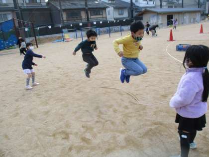 「リズムにあわせて なわをうごかすのが むずかしいなぁ。」