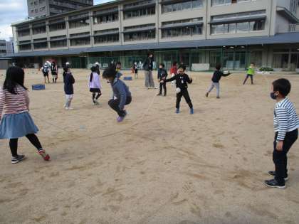 運動場に出て,長縄を使って,わらべうた遊びをしました。