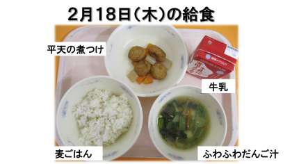 麦ごはん・牛乳・平天の煮つけ・ふわふわだんご汁です。
