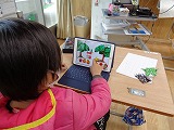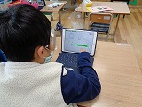 3組にタブレットが届いたので,早速使ってみました。画面の果物をさわってあおむしにえさをあげて育てるアプリを試し,タブレットドリルで国語や社会などの学習を楽しんでいました。