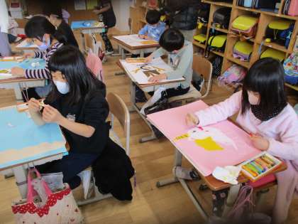 子ども達のイメージは,どんどん膨らんで,とても楽しく表している姿が印象的でした。もちろん自分も絵の中に登場しています♪どんな世界になるのかとても楽しみです♪