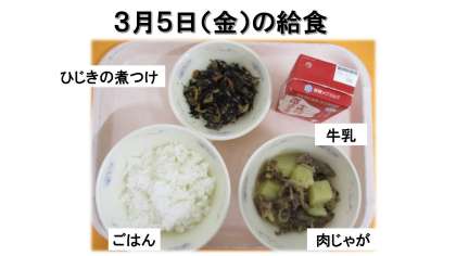 ごはん・牛乳・肉じゃが・ひじきの煮つけです。
