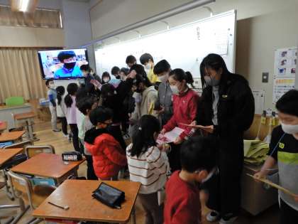 本日6年生を送る会を行いました。「みやびチャンネル」を使って,各学年からの出し物を楽しんだり,1〜5年生が協力して作成したメッセージカードのプレゼントをもらったりと素敵な時間を過ごすことができました。また,プレゼントをもらう瞬間にライブ中継を行い,全校で6年生のうれしそうな表情を見ることができました。うれしくて泣いている子どももいました。