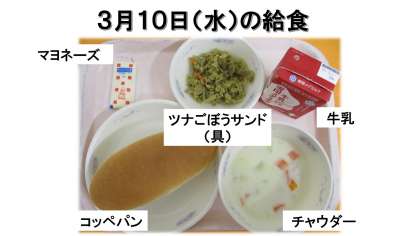 コッペパン(国内産小麦100%)・牛乳・ツナごぼうサンド(具)・チャウダーです。