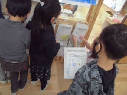 1年生の教室前では,生活科の学習を振り返って,自分のホルダーの中に学習カードをまとめていました。
