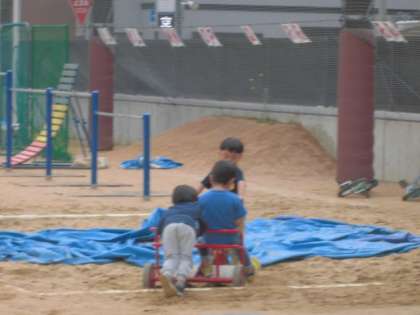 グラウンドの砂場に三輪車がはまり込んで身動きがとれなくなっている楊梅幼稚園のお友達。