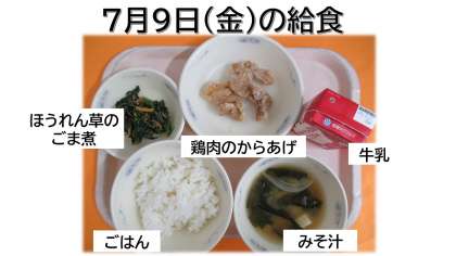 ごはん・牛乳・鶏肉のからあげ・ほうれん草のごま煮・みそ汁です。