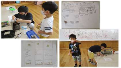 2年生教室の隣の,生活科ルームは,現在「生きもの はくぶつかん」になっています。部屋には,たくさんの生き物を飼っています。2年生の子ども達は,休み時間も生き物達に夢中です。休み時間になると・・・
