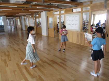 外国語の時間は,感染防止のため相手との距離を十分に取り,楽しくコミュニケーションを取ったり,ゲームをしたりして学習を進めています。