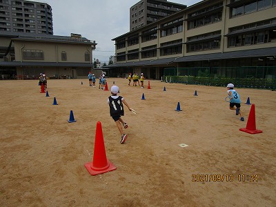 今回は,くねくねリレーです。コース上に置いた3つのコーンをよけながら走り,友達にバトンを繋ぎます。子どもたちは,目をキラキラさせながら,走っていました。