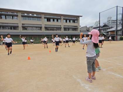 スポーツフェスティバルで取り組む「YOSAKOI雅」の練習を運動場で取り組んでいた時のことです。楽しそうに踊る4年生を見ていた楊梅幼稚園の園児が,一緒に踊りだしました。それを見ていた4年生のうれしそうな表情がとても素敵でした。