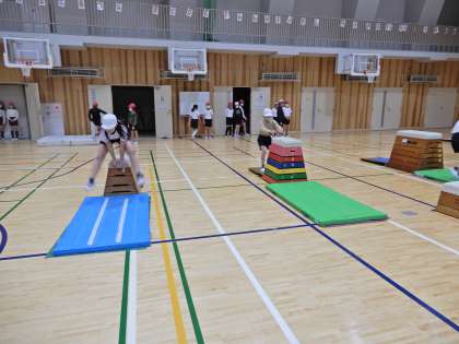 4年生の体育では,「とび箱」に取り組んでいます。久しぶりの跳び越す感覚を楽しみながら,夢中になって開脚跳びをしていました。