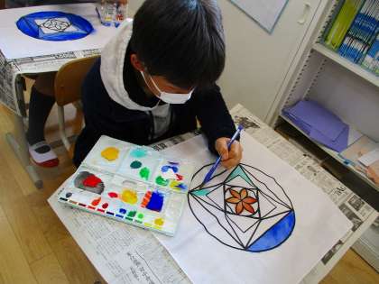 「色を塗るのではなく,染めるという気持ちでやってみよう」と言っていただき,子ども達は,一人一人,思い思いの色をつくって布を染めていきました。