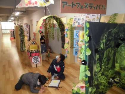 学校中がアートに包まれ,自分の作品がたくさんの人に見てもらえることが子どもたちの喜びや次への意欲につながっています。