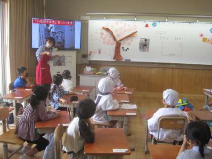 今日から給食が始まりました。3時間目には,給食の準備の仕方や当番のエプロンの着方などを栄養教諭から教えてもらいました。