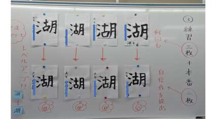 書写の学習で毛筆を行いました。まずは,手本を見ずに自分で「湖」を書きます。次に手本を見て意識したいポイントを書き込み,自分のめあてを立てます。そして,めあてを意識しながら丁寧に書きます。