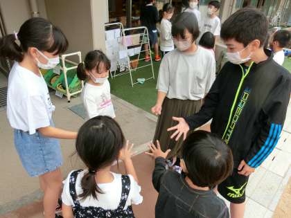 今日はロング昼休みになかよしタイム(たてわり活動)で1年生と遊びました。1年生が楽しめる遊びをグループで考え,雨が上がった空の下で楽しく遊びました。最高学年のお兄さん,お姉さんとしての優しく寄り添いながら遊ぶ姿がとても素敵でした。「1年生に友だちができて嬉しい」と1年生との絆もできました。これからペア学年としてたくさん関わっていく中でまた素敵な姿が見られることがとても楽しみです。