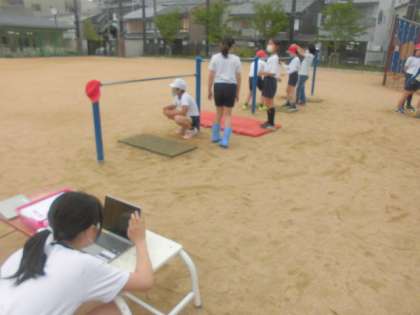 体育科の学習では,鉄棒運動に取り組んでいます。前回りや逆上がりなど,できる技に挑戦したり,できない技を練習したりしています。子ども達は,「もっと足あげたらええで!」「もうちょっと!もうちょっと!」と友達同士で励まし合いながら取り組んでいます。学習を進めていく中で初めて逆上がりができた子どもがいたり,これまでよりも高い鉄棒で技ができた子どもがいたりするなど,前向きに学習に取り組めています。