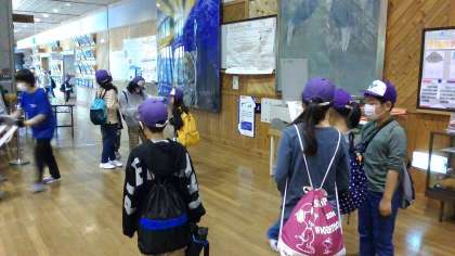 雨天のため,午後の最初の活動は館内ラリーを行います。グループで館内を回り,提示された問題を解いていきます。