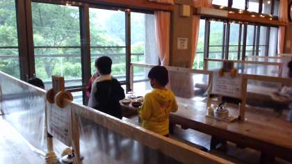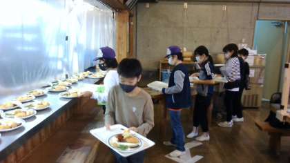 入浴の後は,食堂にて晩御飯の時間となります。グループごとに順番に,晩御飯を配膳しています。