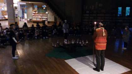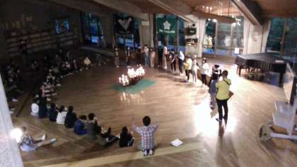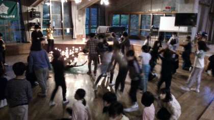 夕食のあとは,本日のメインイベントのキャンドルファイヤーです。雨天のため,キャンプファイヤーではなく屋内で行うキャンドルファイヤーに変更となりました。キャンドルファイヤーでは,火の神と火の子による点火式のあと,各係からのレクレーションを行いました。キャンドルファイヤーを通して,みんなの絆が深まったように感じます。キャンドルファイヤーのあとは,振り返りを全体で行い,就寝となります。