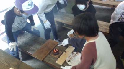 集合写真のあとは,屋外の野外炊事場での活動です。火起こしにチャレンジです。湿気が多い中,火起こしまでに少し時間を要しましたが,仲間と力を合わせて火を起こすことができました。この起こした火を野外炊事でも使います。