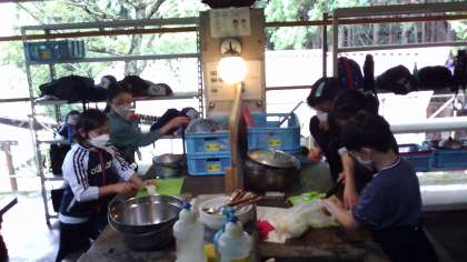 本日のメインイベントである野外炊事が始まりました。所員さんの説明を受け,役割に分かれて準備を進めています。雨も止み,涼しい中で活動ができています。