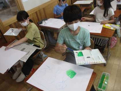 図画工作科では心に残った思い出として,先週行った花背山の家を題材にを絵に表しています。火起こし体験の時の様子やキャンドルファイヤーでの様子を描いています。