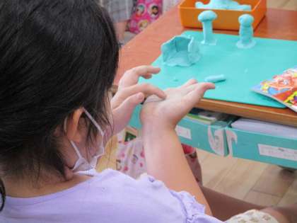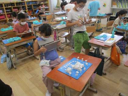 図画工作科「ねんどでマイタウン」では、油ねんどを使って、自分のまちを想像して作りました。「海の中のまちにしようかな」とつぶやいている子どもや「月に住みたいな」と言っている子どもがいました。みんな思い思いにねんどでまちを作ることができました。