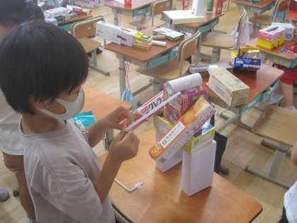 今日の図画工作の時間には,これまでに集めた様々な形の箱を組み合わせて作品を作りました。初めに三つ箱を選んで,それを組み合わせてできた形から想像を膨らませて,動物やロボットなどの形になるようにさらに箱をつなげていきました。