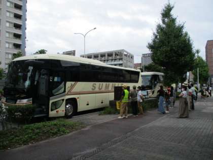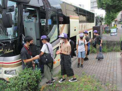 手指の消毒をして、バスに乗車します。いよいよ出発です。これから二時間程バスに乗り、まずは姫路市平和資料館へ向かいます。