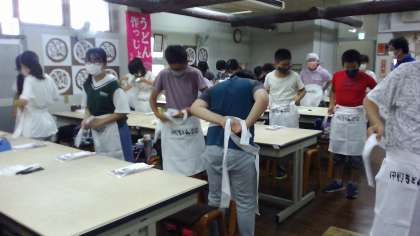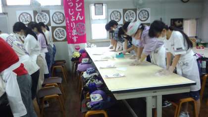 中野うどん学校に到着し、うどん作りに取り組んでいます。子どもたちは自分で作ったうどんを袋につめて、お土産として持ち帰ることを楽しみにしています。