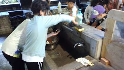 カレーを食べ終え、みんなで片付けをしています。次に使う人が気持ちよく使えるよう、心を込めて洗っています。