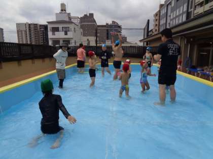 遊戯室で体操をした後、シャワーを浴びてプールへ入り、たんぽぽ組の友達にタッチしたり、一緒に魚のおもちゃをつかまえたりして、楽しく交流しました。「楽しかったね」「また遊びたいね」と、子どもたちは嬉しそうにしていました。