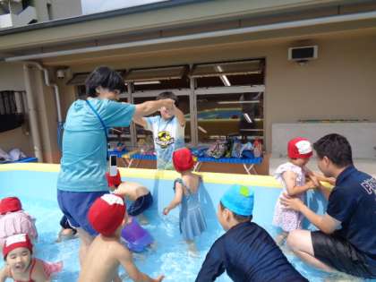 たんぽぽ組さんから「一緒にプールに入りましょう」と招待され、3組の子どもたちはとても楽しみにしていました。