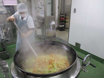 「鶏ちゃん」は岐阜県の郷土料理で、鶏肉が貴重な食材だったころ、お客様や親戚が集まるお盆やお正月など特別な日の料理でした。給食では、鶏肉と野菜を炒めた後、赤みそやしょうゆ、さとうで味付けして仕上げます。子どもたちからは「おいしい!」「ごはんとよく合って、ごはんがとてもすすみます!」などの声が聞かれ、大変好評でした。