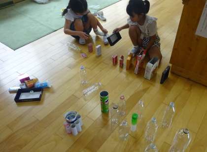 みんなで集めた材料を使って、楽しい遊びを考えています。並べると「ドミノ」や「お店屋さん」ができたり、積むと「バランスゲーム」ができたり、転がすと「ボーリング」や「シューティングゲーム」ができたり、毎時間、友達と話し合いながら、色々な遊びを発見しています。