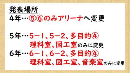 ・ペア学年との交流は後日に延期し、それに伴い発表場所が変更になる学年があります。