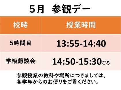 5月10日(金)は今年度最初の参観デーがあります。授業参観のあとは、学級懇談会があります。新しい学年になって1か月が経ちました。子どもたちの学びの様子をご覧いただき、懇談会では担任から学級の様子等のお話をお聞きいただければと思います。