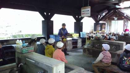 火起こし体験をします。山の家の先生からやり方を教えてもらっています。