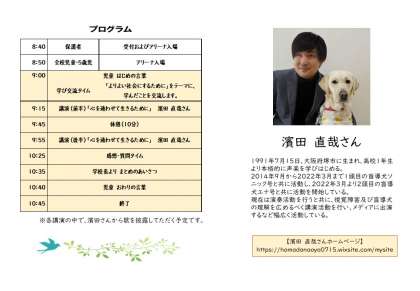 今回はゲストに、視覚障害や盲導犬についての理解を広めるために活動されている、声楽家の濱田直哉さんにお越しいただき、お話や歌を聞かせていただきます。27日(月)に行ったにこにこ朝会では、「バスがきましたよ」の絵本から、視覚障害のある方の日常や自分達にできることについて考えました。当日も、どのようなお話が聞けるのか、子ども達も楽しみにしています。