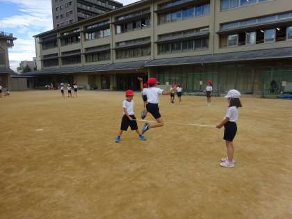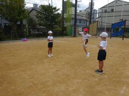 とびあそびでは、じゃんけんで勝ったら進んでいく遊びや、5歩で遠くまで進む遊び、ゴムを跳ぶ遊びなどをしています。一歩を大きくするにはどうすればいいのか、高く跳ぶにはどうすればいいのか、上手くいった方法やコツなどを共有しながら、活動を進めています。