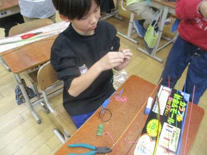 図画工作科の学習では「美しく立つ針金」の学習をしています。針金を使って、自分の美しいポイントを考えながら、創造して作っています。針金を触りながら「これ何にみえるかな?」「あ!これだ!」と言いながら、とても楽しそうに制作しています。