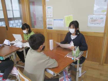 国語の学習では、インタビューをすることで、知りたいことについて相手の考えを引き出し、自分の考えと比べています。今日は、インタビューでそれぞれ聞いてきたことをまとめ、友だちと交流しました。インタビューで聞いてきた、それぞれの思いや考えを自分の言葉で説明していました。新たに分かったことや気付いたことがあり、そのことを自分に置き換え考える姿も見られました。